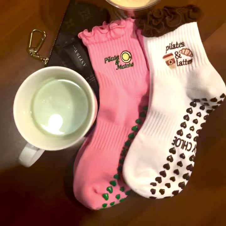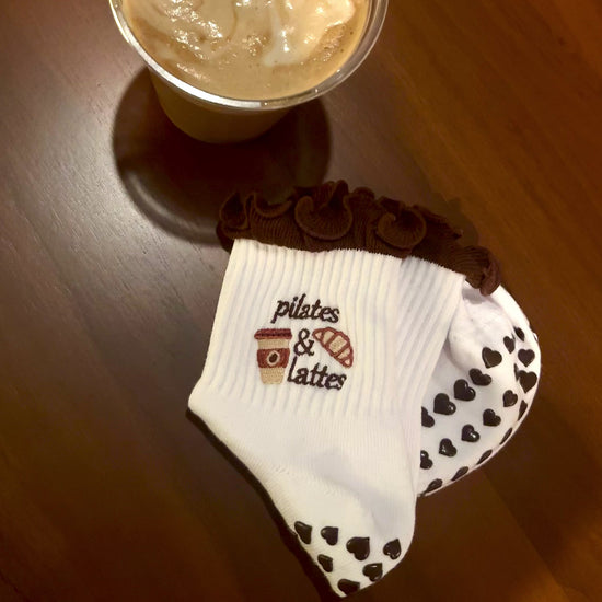 Start your day with a little caffeine and a lot of comfort with our Pilates & Latte Sock — the perfect mix of cozy morning energy and Pilates performance. Designed on a soft white base with a rich brown ruffled edge, these grip socks feature embroidered latte art, a warm cup, and playful lettering that feel like your favorite coffee run in sock form. The bottom is lined with chocolate-brown heart grips for maximum hold during your Pilates, barre, or yoga sessions.